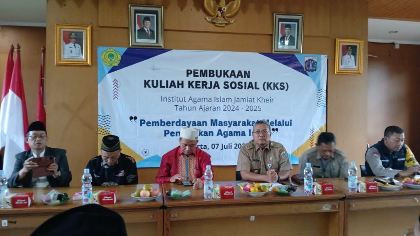 Jakarta (07/07/2025) – Institut Agama Islam Jamiat Kheir Jakarta (IAIJ) kembali menyelenggarakan Pembukaan Kuliah Kerja Sosial (KKS) Tahun 2025 yang berlangsung di Aula Kelurahan Tegal Alur, Kalideres, Jakarta Barat. Kegiatan ini mengangkat tema “Pemberdayaan Masyarakat melalui Pendekatan Agama Islam” dan dihadiri oleh berbagai pihak, baik dari unsur akademisi maupun pemerintah daerah.
